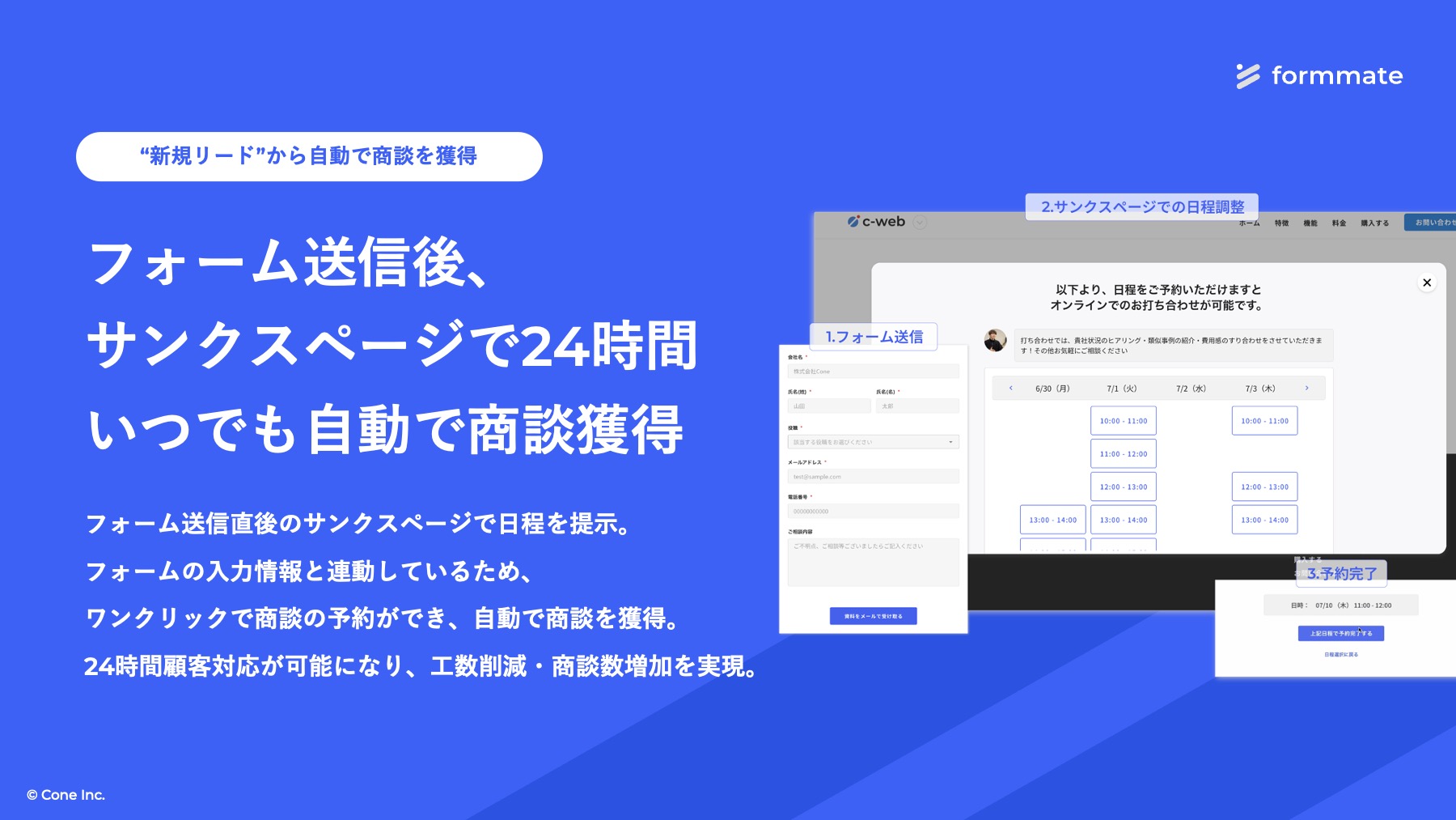 お問い合わせフォーム送信直後に、サンクスページにてフォームと連動した日程調整ツールでWeb会議可能日程を表示することで、自動で商談獲得。24時間顧客対応が可能になり、工数削減・商談獲得数増加。