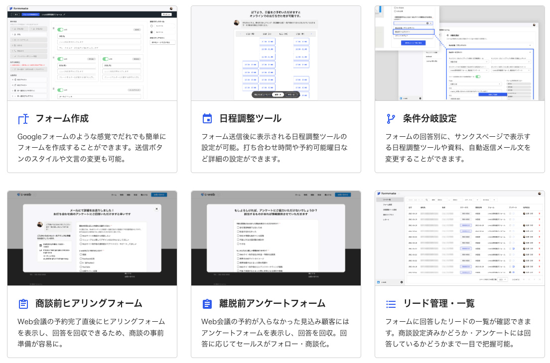 フォーム作成から日程調整機能、条件分岐の設定から各種フォーム作成まで幅広い機能を実装。formmateだけほぼすべての業務を完結できます。