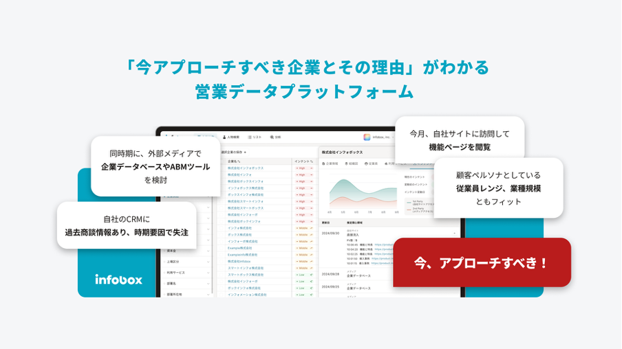 infobox(インフォボックス)は「今アプローチすべき企業とその理由」がわかる、営業データプラットフォームです。自社保有データとinfoboxデータを統合したデータベースをAIが解析。『誰に・いつ・なぜ』動くべきかのアクションまで提示します。
